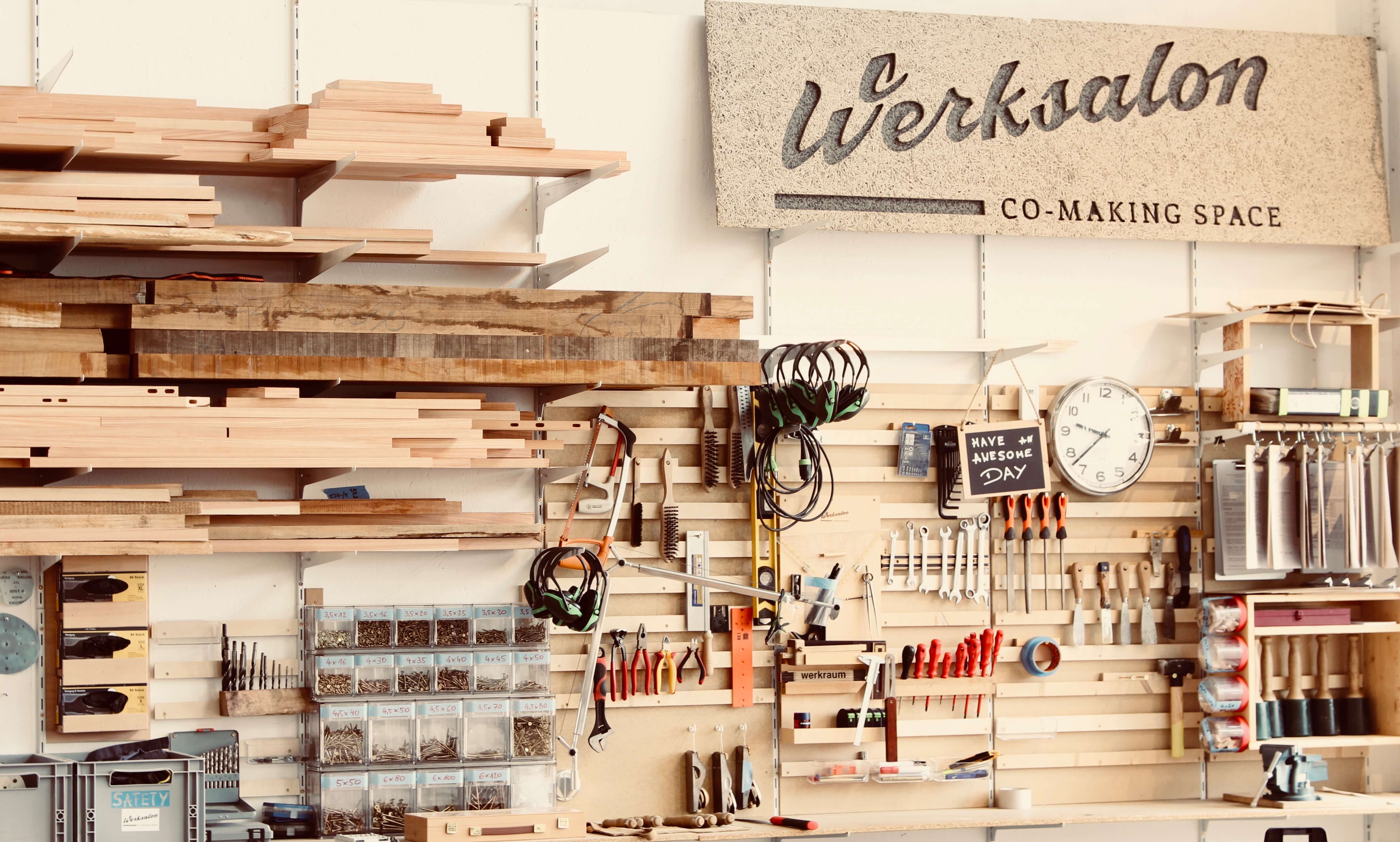 Werksalon is for craftspeople and designers. We are a community to collaborate (co) while creatively producing things (making). You'll rather find work benches, tools and creative ateliers than meeting spaces, printers and office folders at Werksalon.